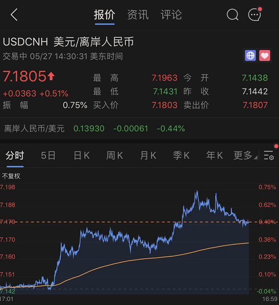 5月28日港股开盘后一路下跌,最多时下跌超过2%。人民币汇率也再起波澜,从5月27日晚间到28日凌晨,人民币离岸一度狂贬500点。分析指出,近日人民币汇率持续走贬的主要原因是避险情绪下美元指数维持高位震荡。